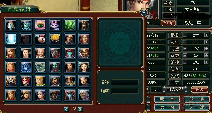 回归正题,百鬼夜行:玩家大于30级单人在长安(44,101)玄冥子进入活动场地,每星期七次,每场60分钟挑战30关,干掉30个获得称谓鬼见愁,60个载鬼一车,108个百鬼夜行.ALT+W点荣誉再点百鬼可以看到108种怪物图鉴,难度分别从☆到★★★★★.每关怪物都是随机的,但总体都是由易到难的出现,而在20关时有几个怪是团体出现的,比如四大魔王和四圣兽,还有几个宠物加小圣,莫非有什么规律?
