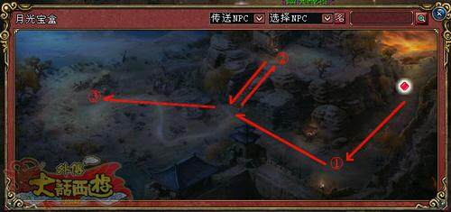 玩家从地图右上角出生点出现,遇见紫霞,玩家沿路跟下去却发现天色已晚,在山下遇见紫霞变成的青霞(第一个BOSS),对话后触发战斗。继续向前探索,山脚楼梯口处将给予提示山上有动静,玩家沿楼梯上山后发现黑山老妖(第二个BOSS)正欲吸人精气,触发boss战。战胜后黑山老妖交代是受宝物出现的仙气所吸引,宝物应该在沙漠深处,坐标约为xx xx点。玩家按指引前去,遇至尊宝在偷看,观音、猴子对峙,唐僧在地上唧唧歪歪….选择拉架的玩家自主选择其一,触发战斗,战斗结束后玩家点击月光宝盒传出副本。